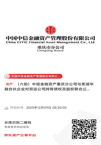 中國中信金融資產(chǎn)管理股份有限公司重慶市分公司(簡稱:中信金融資產(chǎn)重慶分公司)與蕪湖華融資本創(chuàng)榮投資中心(有限合伙)(簡稱:蕪湖華融合伙企業(yè))對重慶雙遠實業(yè)(集團)有限公司(簡稱:雙遠公司)持有債權及股權,將于2025年12月9日08時30分至2025年12月9日17時30分在京東拍賣網(wǎng)通過公開競價方式進行處置,拍賣鏈接如下圖所示,現(xiàn)予以公告。