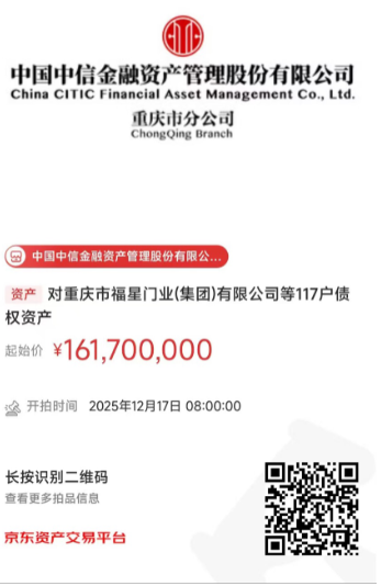 中國(guó)中信金融資產(chǎn)管理股份有限公司重慶市分公司(以下簡(jiǎn)稱我分公司)擁有對(duì)重慶市福星門業(yè)(集團(tuán))有限公司等117戶不良債權(quán)資產(chǎn)。我分公司將于2025年12月17日8:00至2025年12月17日18:00止在京東拍賣網(wǎng)通過公開競(jìng)價(jià)方式進(jìn)行處置,拍賣鏈接如下圖所示,現(xiàn)予以公告。