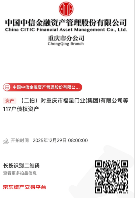 中國中信金融資產(chǎn)管理股份有限公司重慶市分公司(以下簡稱我分公司)擁有對重慶市福星門業(yè)(集團(tuán))有限公司等117戶不良債權(quán)資產(chǎn)。我分公司將于2025年12月29日8:00至2025年12月30日17:30止在京東拍賣網(wǎng)通過公開競價方式進(jìn)行處置,拍賣鏈接如下圖所示,現(xiàn)予以公告。